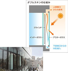 建物東西の外壁窓には「ダブルスキン構造」を採用し、断熱・遮熱効果により空調負担を軽減しています。