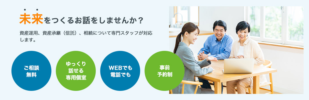 掲載している商品は、所定の手数料等がかかります。ご検討にあたっては、各商品の「パンフレット」等をお客さまご自身で必ずお読みください。詳しくは当行スタッフまでお尋ねください。