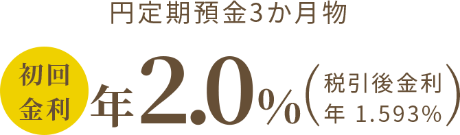 - ●上記金利は、初回3か月の適用金利となります。3か月経過後は自動継続され、当行所定の店頭表示金利が適用されます。最新の金利は窓口または預金金利一覧でご確認ください。