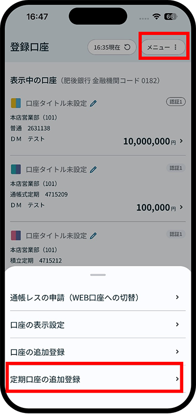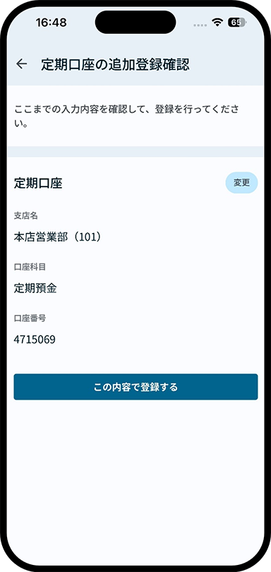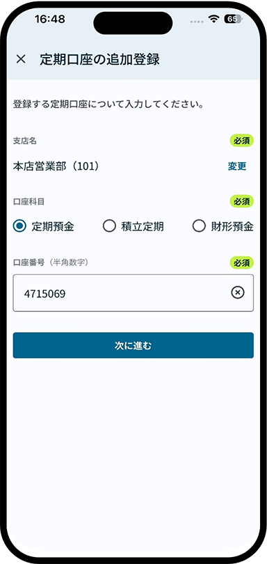 - 同一支店でない定期預金、財形預金、積立定期預金は、ワンタイムパスワードの設定後に「登録口座」より追加登録ができます。