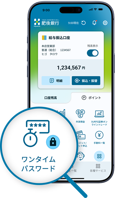 肥後銀行アプリをダウンロード後、ホーム画面の「ワンタイムパスワード」のアイコンより設定をしてください。