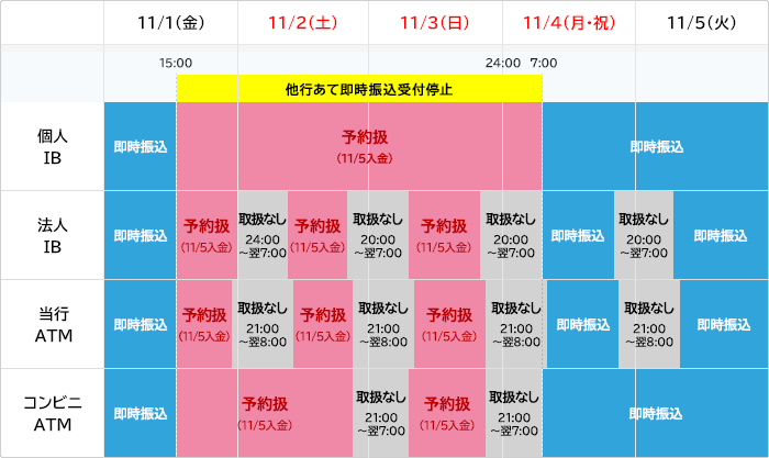 - 当該期間中に受付した他行あての振込は、予約扱いとなり、11月5日(火)のご入金となります。