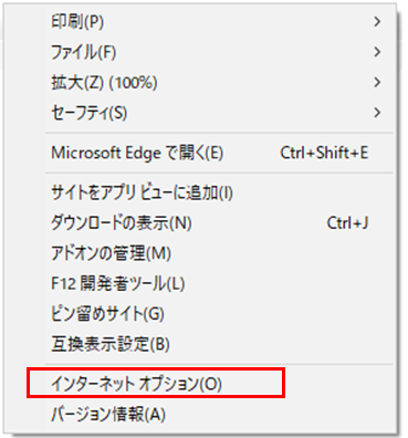 (1)Internet Explorer右上のメニューバーより[ツール]-[インターネットオプション]の順にクリック