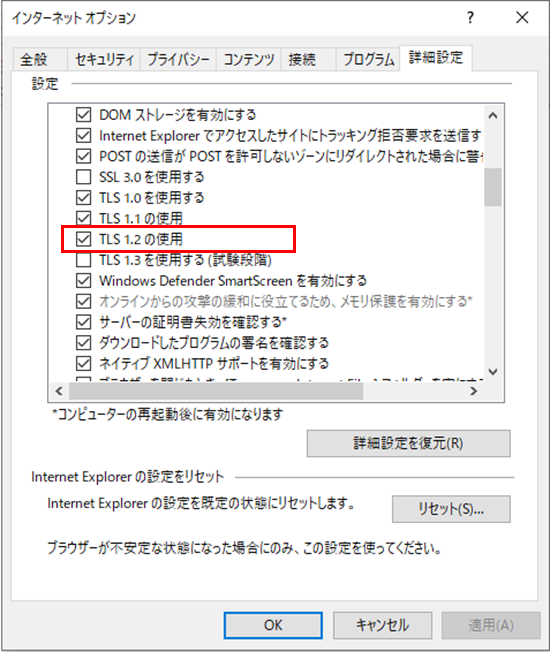 (2)[詳細設定]タブをクリックし、[TLS1.2の使用]にチェックを入れて[適用]、[OK]をクリック