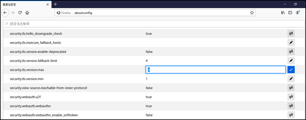 (3)高度な設定の画面にて、設定名[security.tls.version.max]の値を”3”に変更