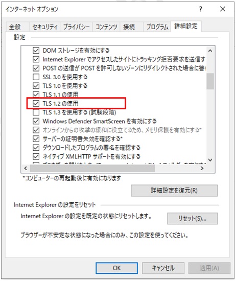 以下の〈参考〉TLS1.2設定方法でご確認ください。