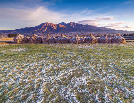「藁小積み」とは、稲刈り後の藁を乾燥させて束にまとめ、積み上げたものです。阿蘇地域に伝わる昔ながらの藁の保存方法で、冬の間、畜舎で暮らす牛馬の餌や敷料に使いました。